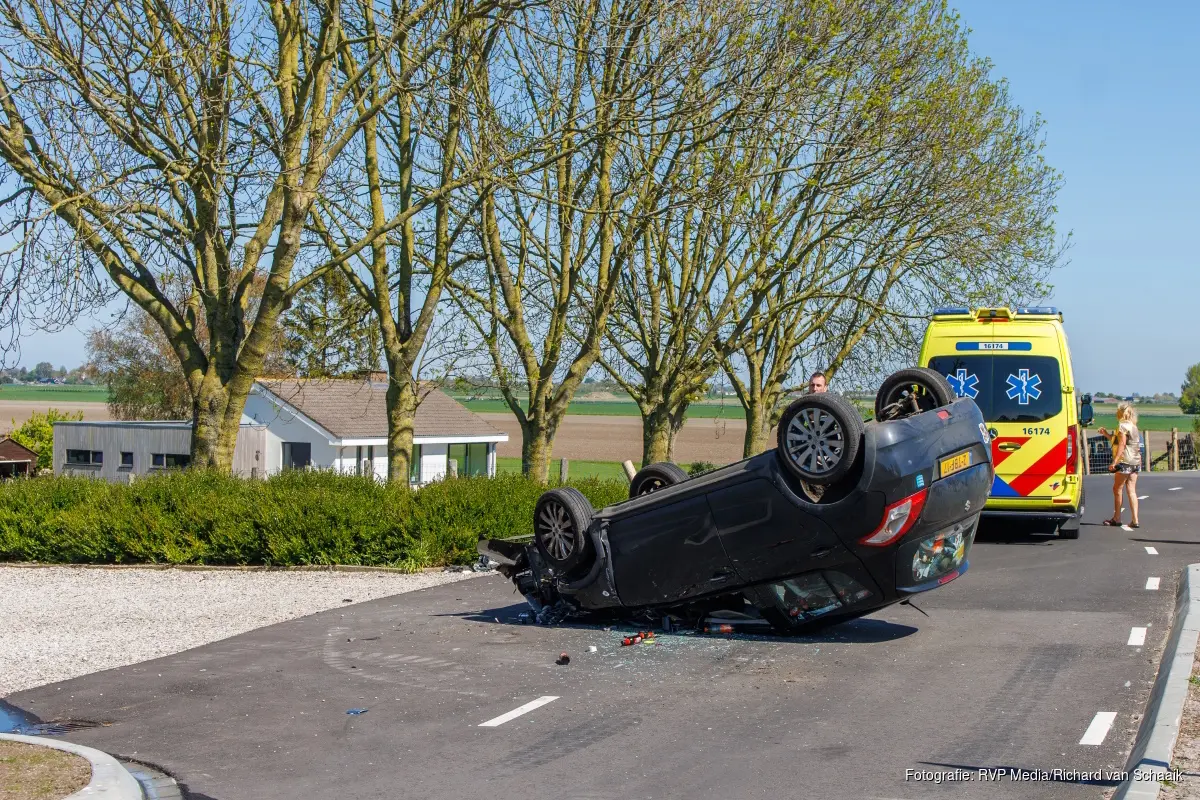 Een automobilist zag door nog onbekende oorzaak een betonblok over het hoofd waarna de bestuurder er tegen aan reed en uiteindelijk over de kop op de weg tot stilstand kwam.