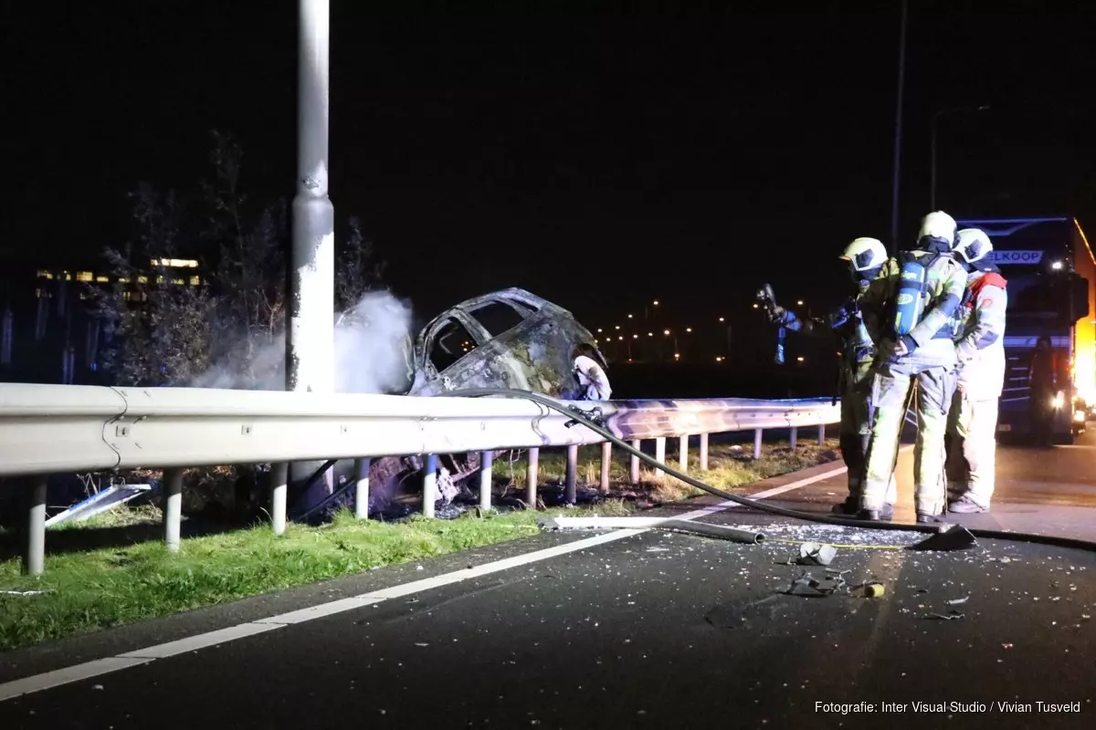 Getuigen zagen hoe een auto crashte, achter de vangrail tot stilstand kwam en in brand vloog. Zij schoten te hulp en haalden de bestuurder weg van het voertuig. Ambulancepersoneel bracht het slachtoffer vervolgens met spoed naar het ziekenhuis.