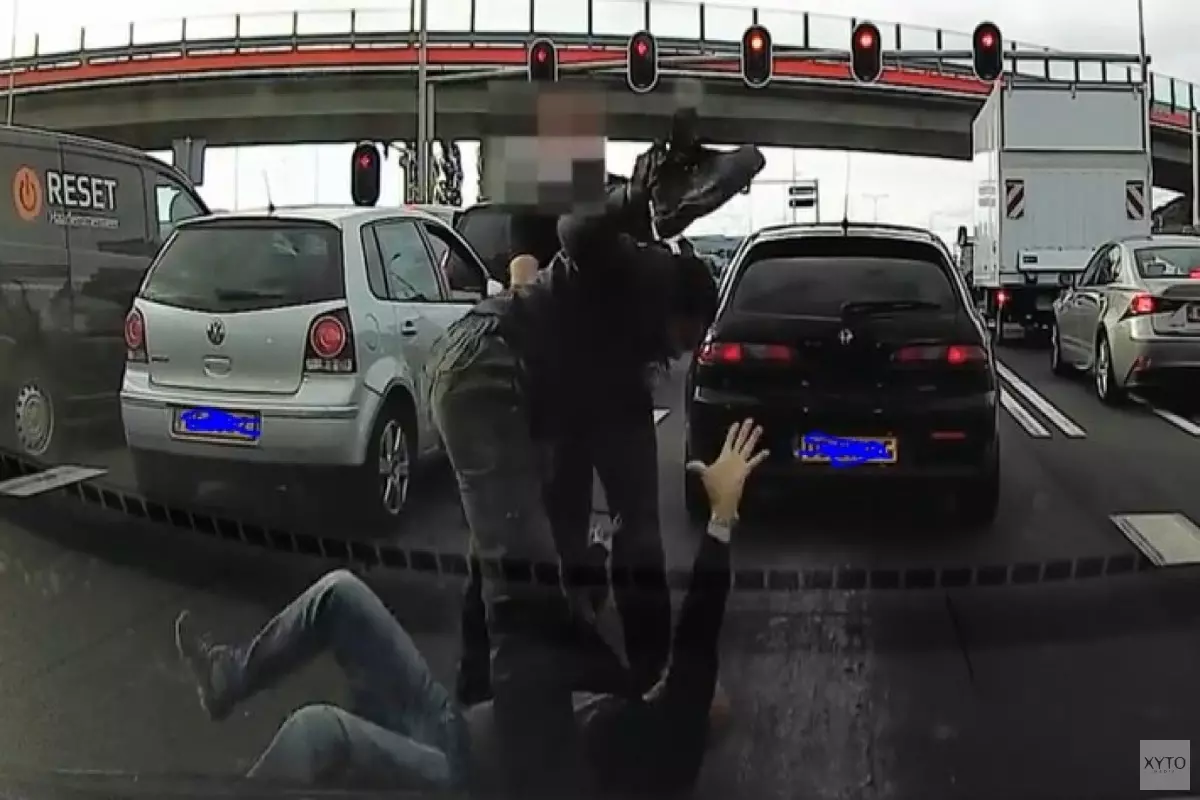 AALSMEER - Via Dumpert zijn heftige beelden opgedoken van een vechtpartij op de snelweg in de buurt van Aalsmeer. Op de video is te zien hoe de bestuurder van een auto meerdere keren wordt geslagen door een man terwijl hij op de grond ligt. De agressieveling bleef doorslaan totdat hij door omstanders weg wordt getrokken. Ook daarna sluimert de ruzie nog lang door omdat de vechtersbazen van geen ophouden wisten.