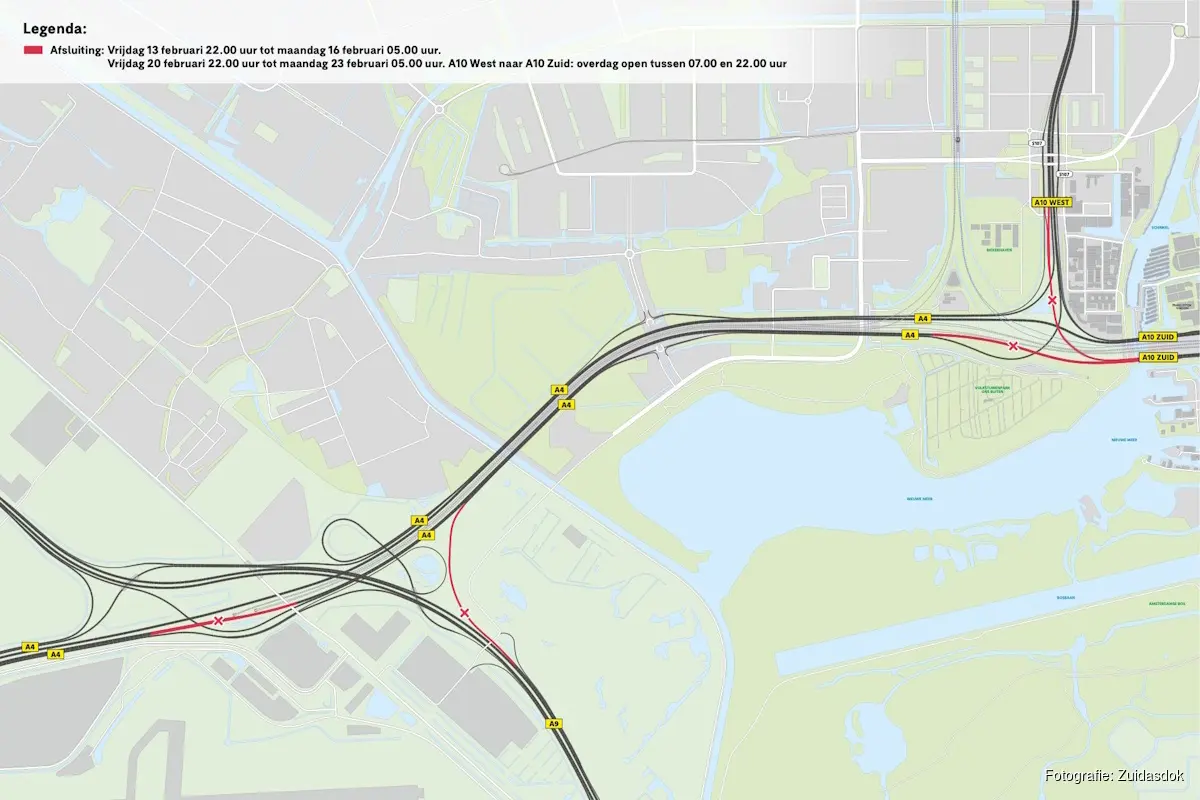 De (gedeeltelijke) afsluiting van de A4 start vrijdagavond 13 februari om 22.00 uur en duurt tot maandagochtend 16 februari 05.00 uur. Hetzelfde @jdschema geldt van 20 tot 23 februari. Het wegverkeer vanuit Schiphol kan omrijden via de A9 en A5 en vanuit Amstelveen via de A9 en A2. Wie de weg opgaat wordt aangeraden voor vertrek de route de checken op TomTom Go, Waze of Apple Maps. Reizigers kunnen reisadvies opvragen via Ask & Go of zich opgeven om via Whatsapp geattendeerd te worden op een aanstaande wegafsluiting.