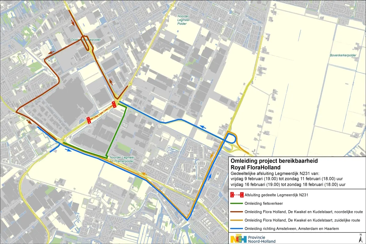 De Legmeerdijk (tussen de N201 en de ingang van Royal FloraHolland) is van vrijdag 9 februari 19.00 uur tot en met zondag 11 februari 18.00 uur en van vrijdag 16 februari 19.00 uur tot en met zondag 18 februari 18.00 uur in beide richtingen afgesloten voor het wegverkeer.